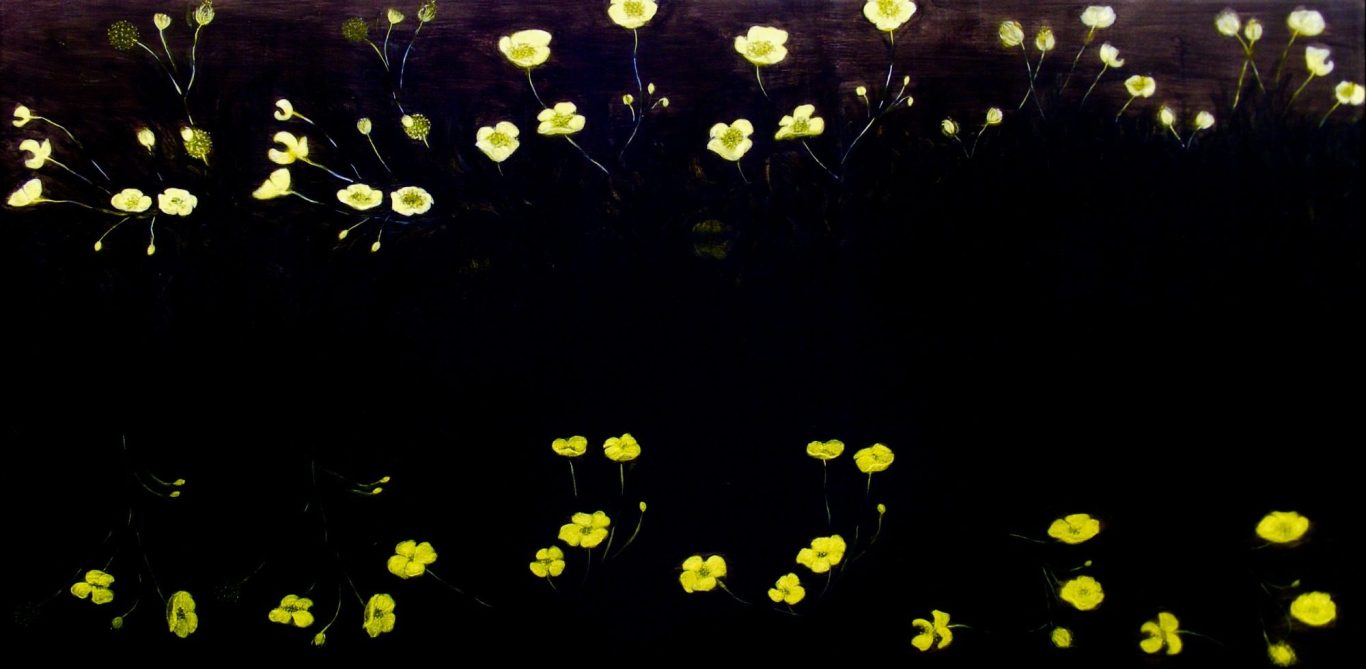 Buttercups - chosen for their resilience, strength and determination, forcing their way through the Forsythia and ferns.
