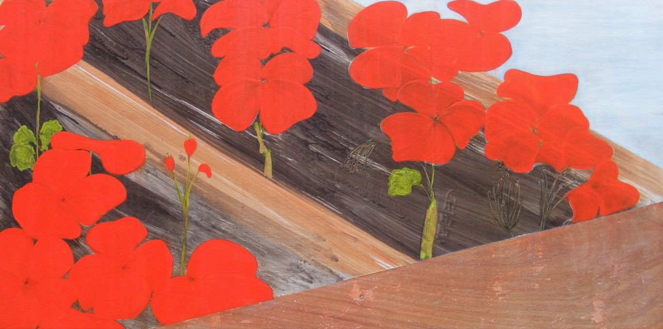 Geraniums - chosen for their vibrant red colour. A drawing, then a painting of the poor display in the containers, in my garden.